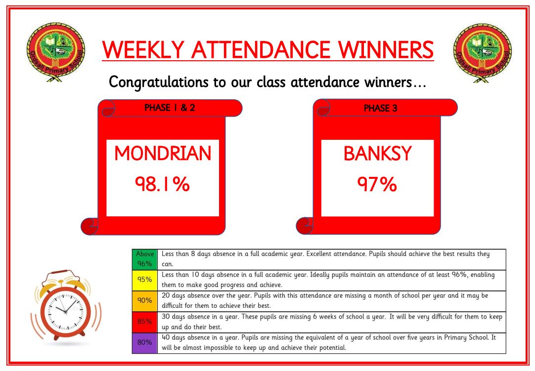 Finally, congratulations to our attendance champions this week: Mondrian Class topped Phases 1 and 2 with a brilliant 98.1% attendance, and Banksy Class led the way in Phase 3, also with 97%.
