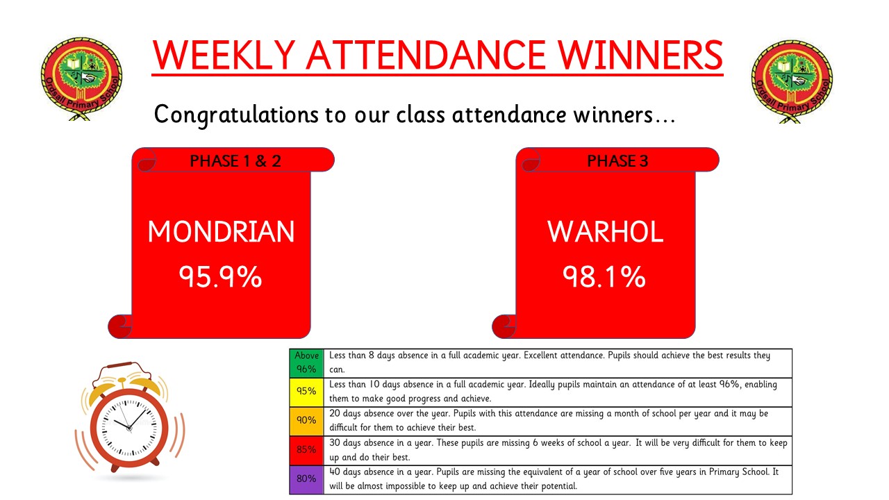 Finally, congratulations to our attendance champions this week: Mondrian Class topped Phases 1 and 2 with a brilliant 95.9% attendance, and Warhol Class led the way in Phase 3, also with 98.1%.